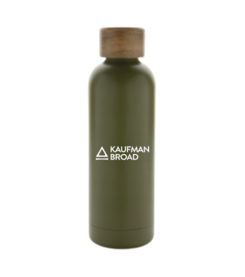 Bouteille iso en acier inoxydable recyclé avec un bouchon en bois d´acacia.