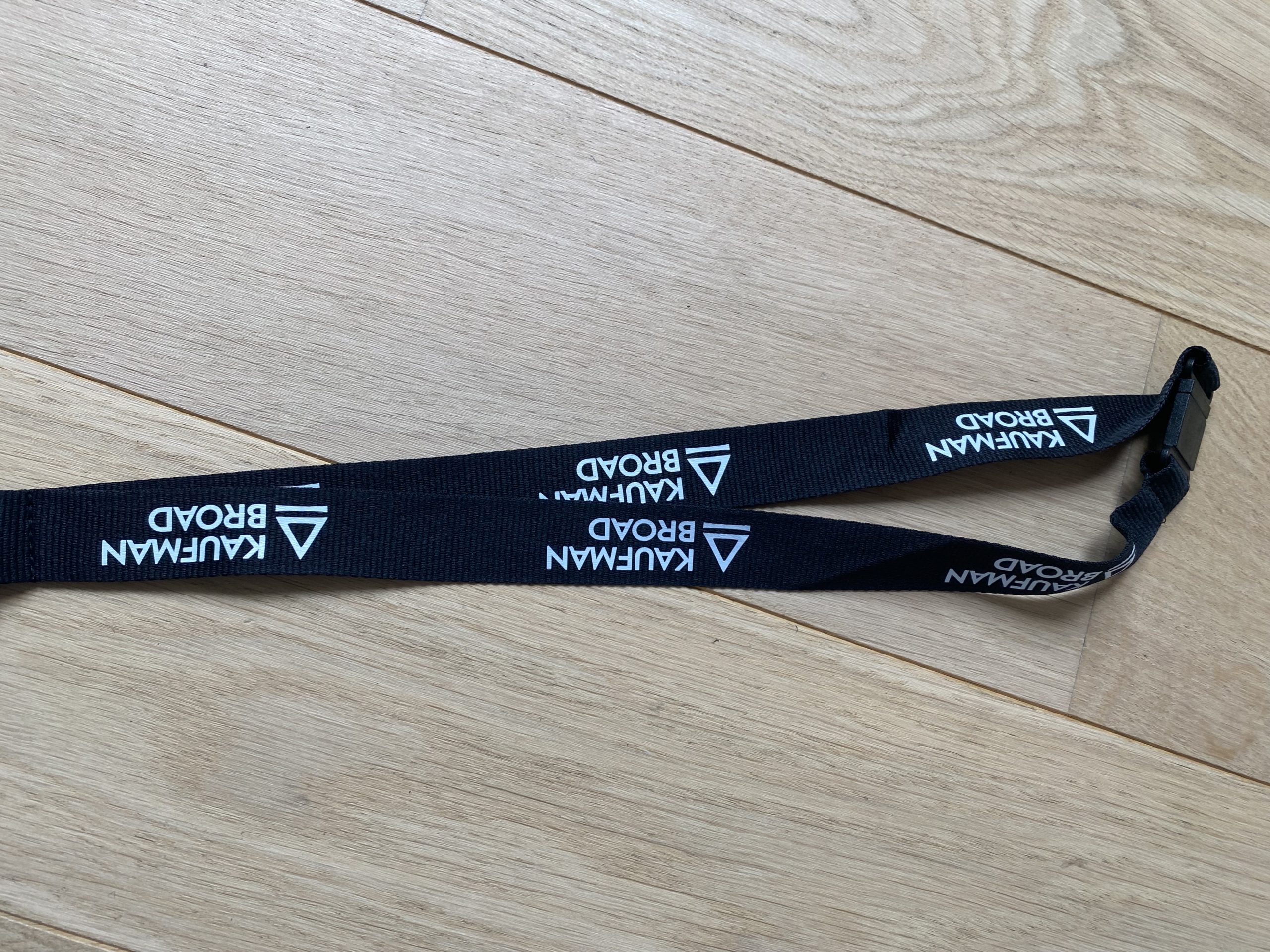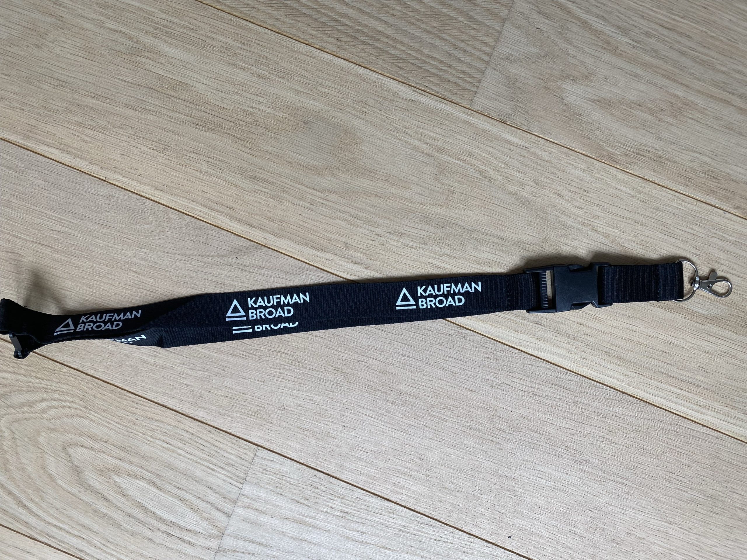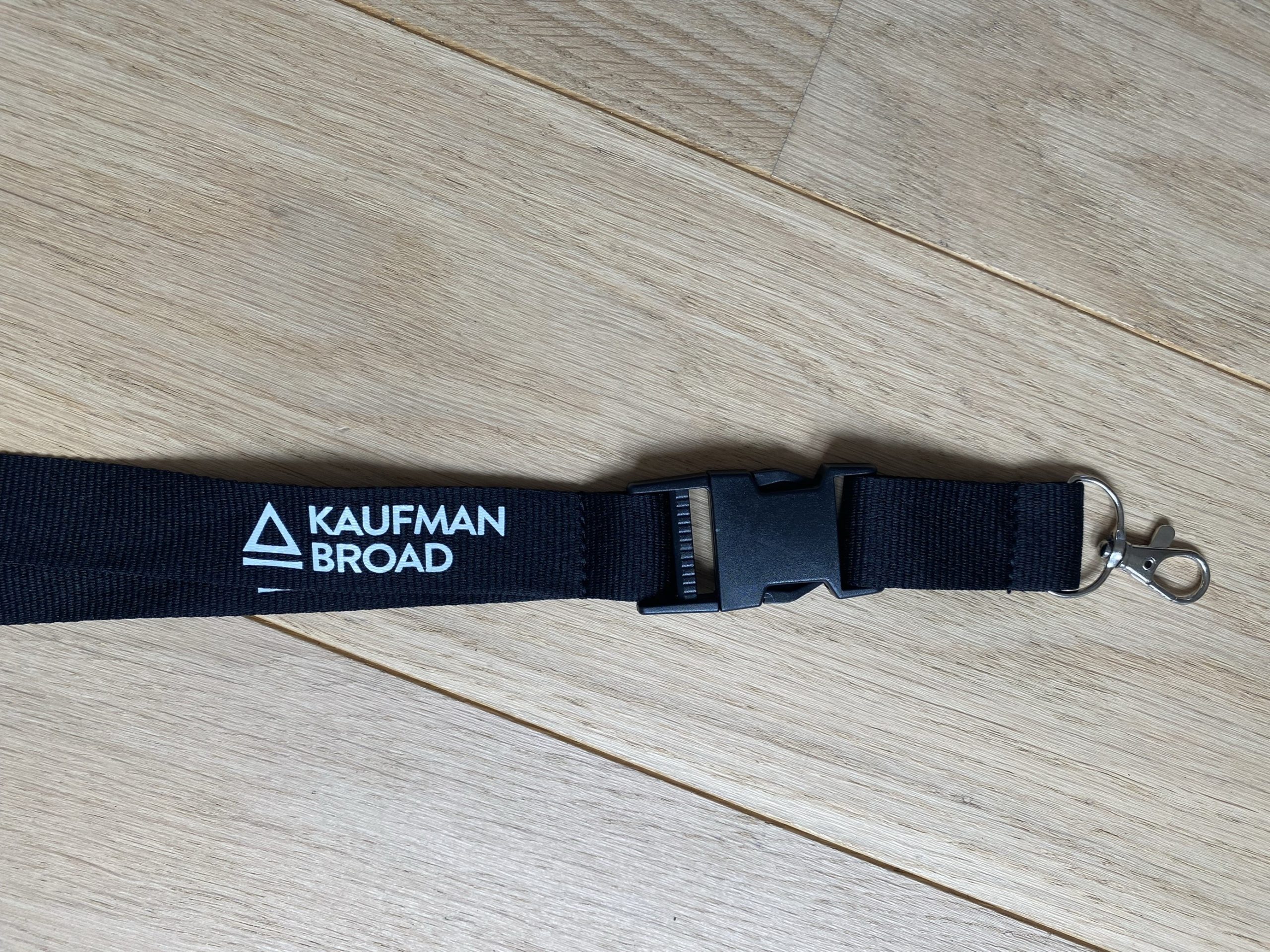Tour de cou plat en polyester. Avec boucle détachable et crochet métal. Avec option accroche de sécurité (S1) Longueur 40cmx2 + 6cmx2. Largeur 20 mm. KAUFMAN & BROAD imprimé en répétition sur une face recto